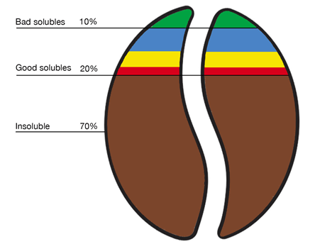 About 20% of the bean contains good solubles, and the other 10% are bad and taste awful. To brew the best cup of coffee, we must try and release the good solubles while leaving the bad ones locked up in the cells.