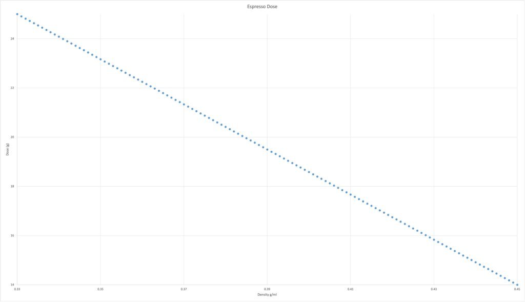 The real-world range you see is from very dark roasts with 100 ml weighing as little as 33g, i.e., 0.330 g/ml, up to very light roasts where 100 ml weigh as much as 45g, i.e., 0.450 g/ml. That gives us 450-330=120 different roast levels measured in 0.1g steps.